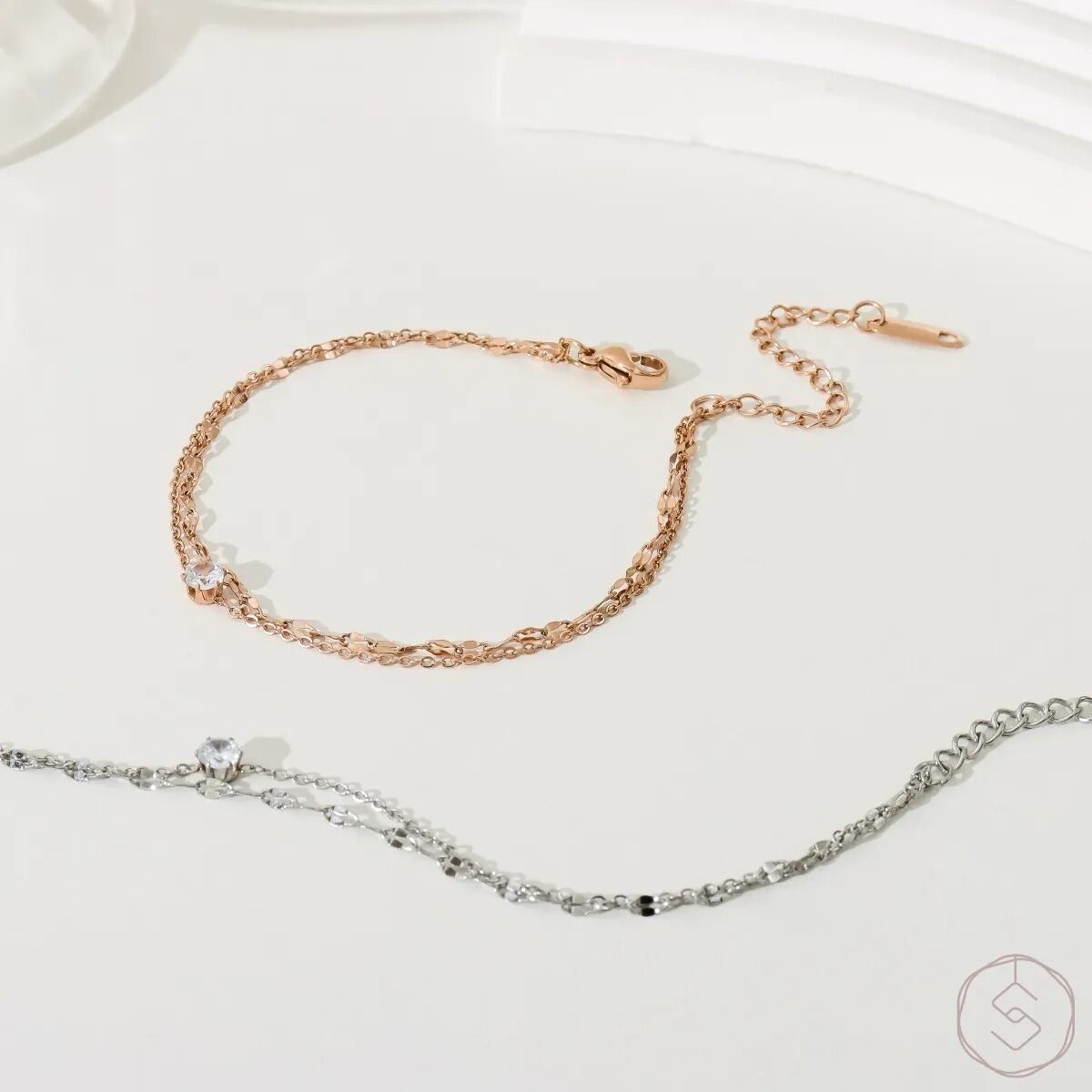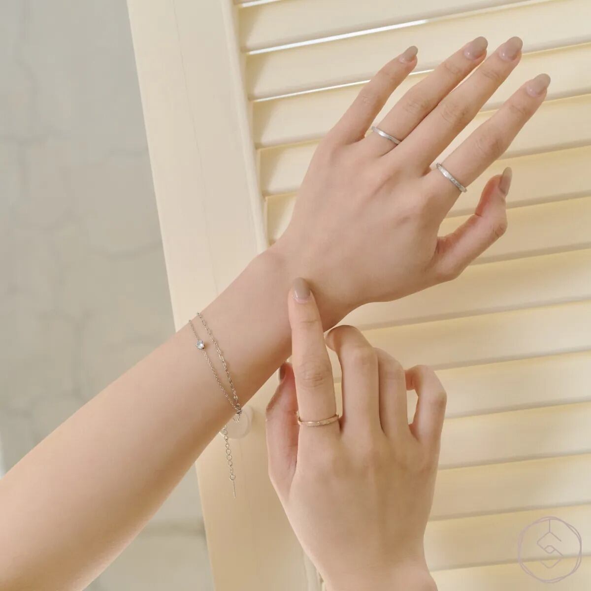 動くたびに光がリズムのようにきらめき、手元に印象的なアクセントを添えます。整いながらもどこかやわらかさを感じさせるデザインが、洗練された雰囲気を引き立てます。